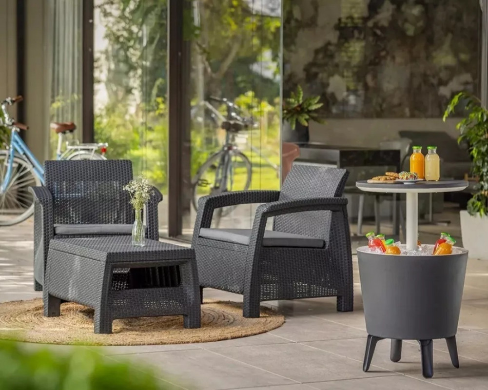 • -El Cool Bar es una mesa de cócteles de aspecto moderno y un refrigerador práctico para barbacoas y otros eventos al aire libre.